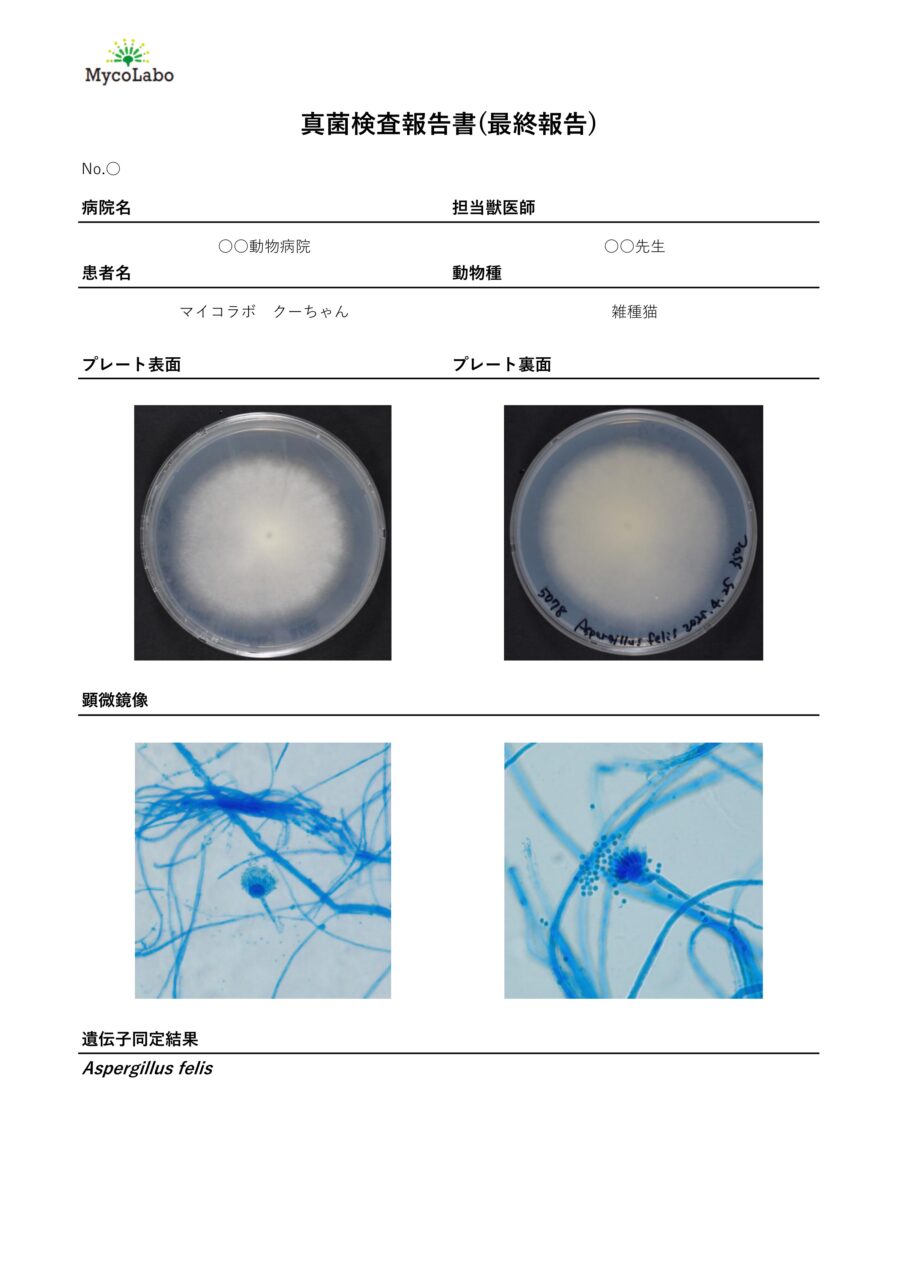 シンプルでわかりやすい報告書を心掛けています。真菌症は治療期間が長く、完治にいたるまでは飼い主様の協力がかかせません。病原体の写真を提示することで、飼い主様が真菌症を具体的にイメージしやすくなり、治療への理解やモチベーション向上にもつながっている、とのお声をいただいています。